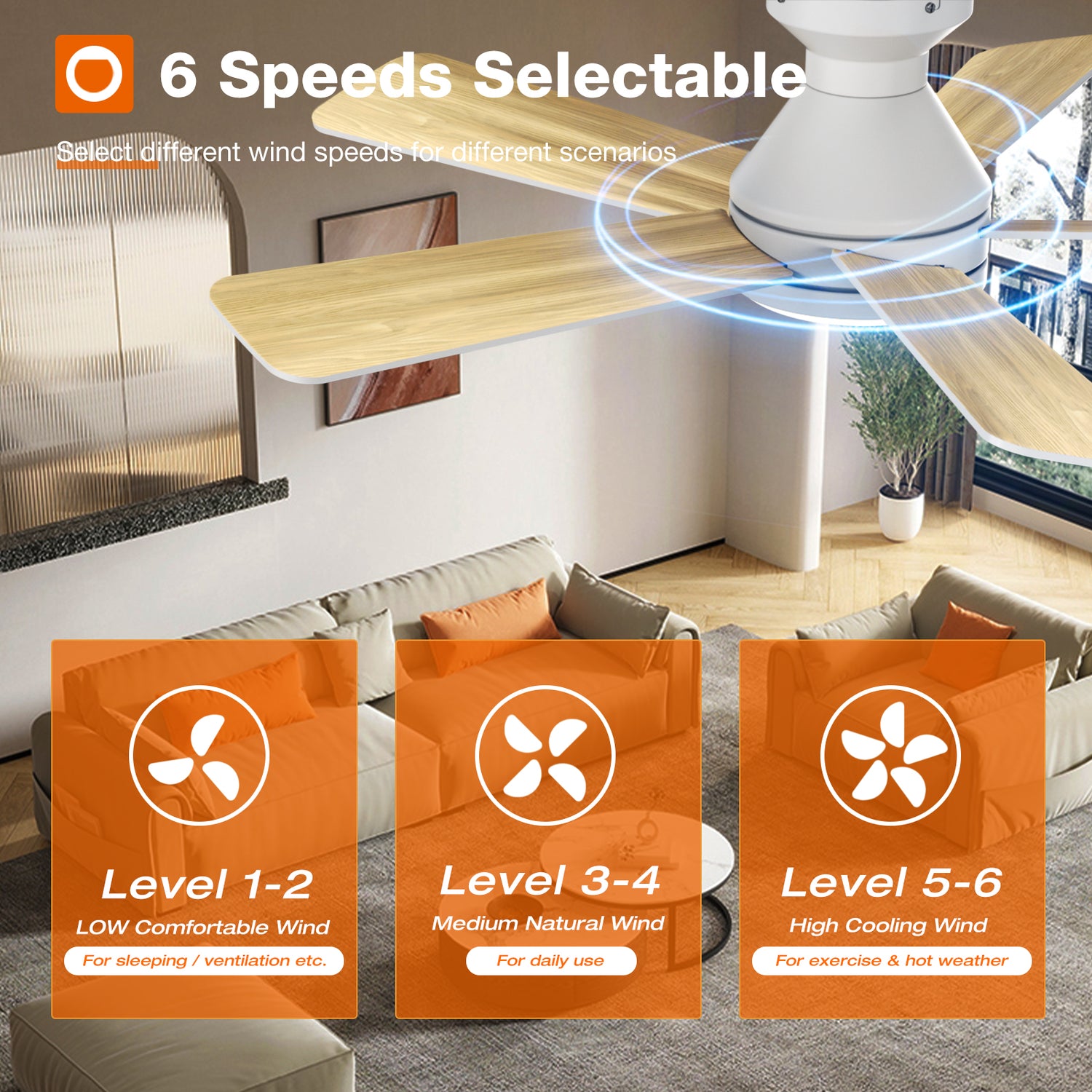 • Reversible DC Motor: The high-quality & high-speed motor brings a perfect wind experience. The wind speed can be adjusted in 6 gears, you can choose between comfortable wind, natural wind and strong wind. Reversible dual-direction fan improves air circulation to keep you warm in winter and cool in summer. Our fan blades are double sided in different colors, one side is white and the other side is yellow wood grain. Choose the fan blade color that best fits your home decor!